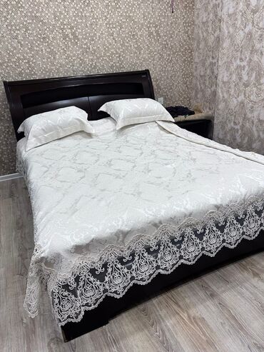 - İki nəfərlik çarpayı: Yüksək, taxta başlıq və ayaqlıq, hamar radius künclər. Ağ rəngli naxışlı örtük və 2 uyğun yastıq üzlüyü fotoşəkildə göstərilib.