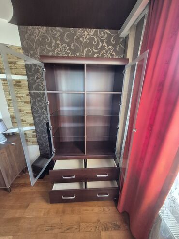 - Material: tünd qəhvəyi laminat (ağac teksturası), qabaq hissəsi şüşə qapılarla
