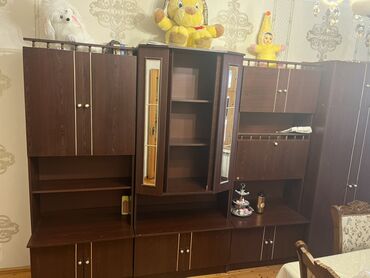 Mebel dəsti – şkaf-vitrin komplekti - Material: tünd rəngli ağac/qablaşdırılmış MDF görünüşlü mebel, dekorativ frezələr və klassik panellərlə. - Komplekt tərkibi: - İri divar boyu şkaf sistemi: ...