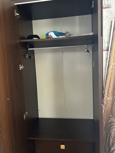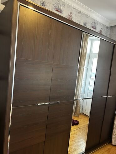 Qapalı qarderob şkafı – tünd qoz rəngdə, çoxbölməli.