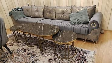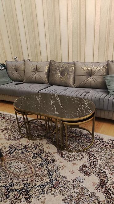 Türk istehsalı 3-lü nestinq stol seti - Dairəvi forma, mərmərə bənzər parlaq üst səth - Qızılı rəngdə metal karkas və dayaqlar - Bir-birinin altına yığıla bilən konstruksiya – yerə qənaət - Qonaq ...