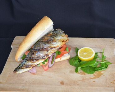 - Balıq sendviçi (balık ekmek): Təzə qril edilmiş balıq filesi (xırtıldayan qabıq, şirəli iç) uzun baget çörəyində verilir. İçlikdə doğranmış pomidor, qırmızı soğan, göyərti; yanında limon dilimi və yaşıl yarpaqlar. İsti-isti servis üçün idealdır.