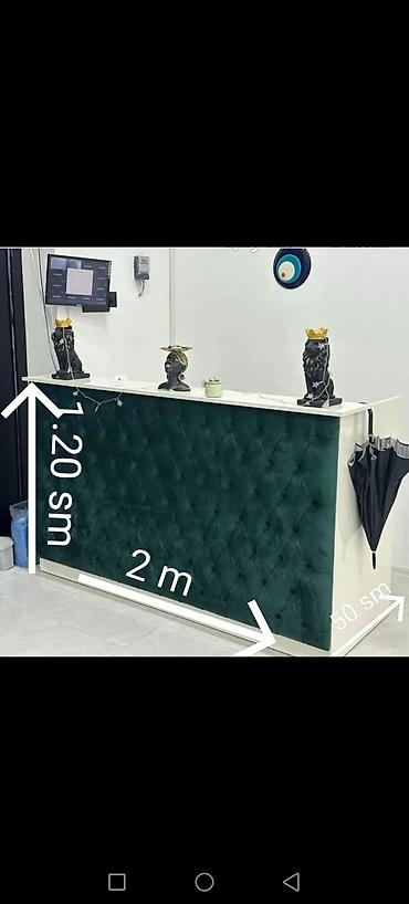 - Resepsiyon stolu: Ön paneli yaşıl məxmər toxumalı, kapitone (çarniyerli) dizayn. Korpus ağ rəngdədir. Üst hissə genişdir, kompüter və POS avadanlıqları üçün uyğundur.