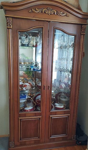 - Vitrin şkafı: iki şüşə qapılı, içəridə şüşə rəflər; üst taxtabənddə dekorativ oyma və qızılı akssentlər; aşağı hissədə ağac panelli bölmələr.
