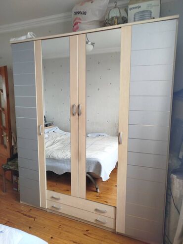 Müasir dizaynlı yataq otağı mebel dəsti Tərkib: - Geniş çarpayı: yumşaq panel başlıq, ağ-beton teksturalı və ağ korpus, taxta dekor elementləri. - 3 qapılı qarderob: mərkəzdə tam boy güzgü panellə...