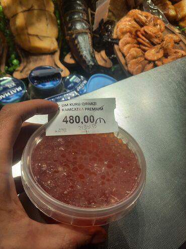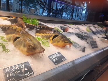 - Vitrində həm bütöv yerli nərə balığı (buz üzərində), həm də müxtəlif hissələr – file, bel hissəsi, boyun və soyudulmuş dilimlər təqdim olunur.