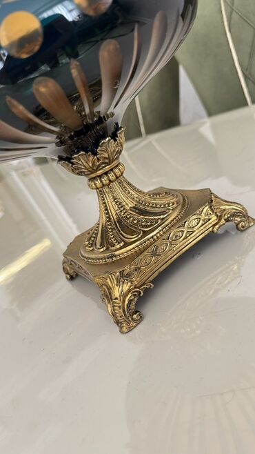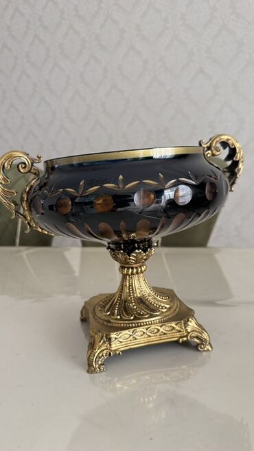 BohemiyaTutacaqlı və qızılı rəngli metal dayaq üzərində yerləşən, tünd rəngli şüşədən hazırlanmış dekorativ qab. Qabın üzərində incə qızılı naxışlar və dairəvi kəsiklər var. Dizaynı klassik və zərif görünüşə malikdir. Ev və ofis interyerini bəzəmək üçün uyğundur.