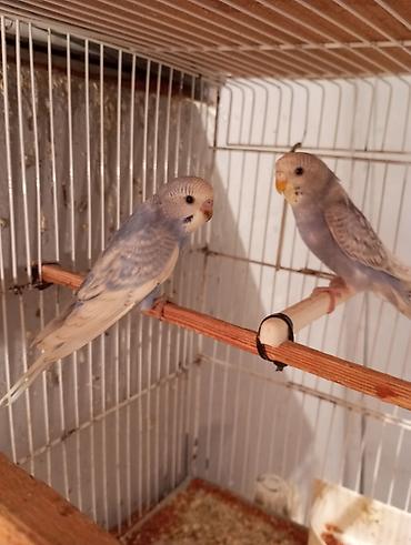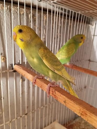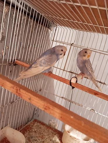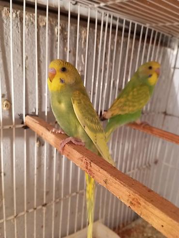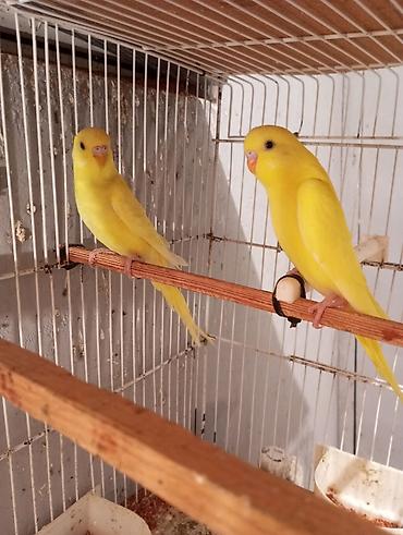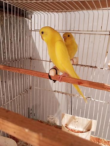 Nömrəli qəfəzdə iki dalğıç papağan (büdcəri) cütü. Xüsusiyyətlər: - Rənglər: biri tam sarı (lutino), digəri yaşıl-sarı, qara zolaqlı baş naxışları və mavi gaga üstü. - Növ: budgerigar (undulat). -...