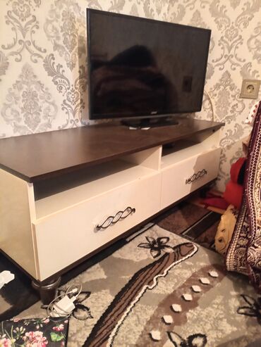 Təmiz və səliqəli vəziyyətdədir. Üst hissəsi tünd rəngdə, alt hissəsi parlaq dekorlu dizayndadır. Geniş bölmələri və çəkməcələri var, həm TV üçün, həm də əlavə əşyalarınızı saxlamaq üçün ideal seçi...