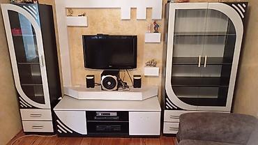 - Komplekt: TV stendi ilə birlikdə iki şkaf-vitrin, alt tumbalar və asma dekor rəflər