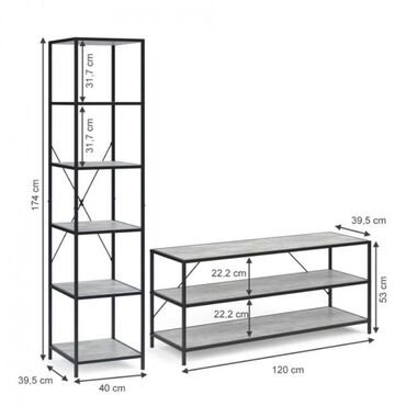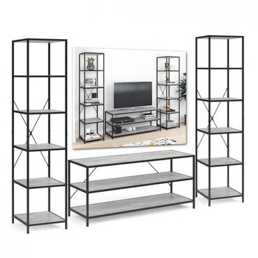 Loft üslubunda çoxfunksiyalı dolab sistemi - Material: ağac teksturalı LDSP panellər + qara tozboyalı metal karkas - Dizayn: açıq rəflər, iki ədəd qapılı bölmə və sol tərəfdə 2 çekmecəli tumba -...