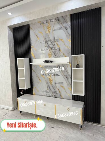 - Müasir dizayn: TV üçün aşağı tumbalar və yuxarı divar modulları ilə komplektlər. Minimalist xətlər, dekorativ vertikal panellər və mərmər effekti fonlarla uyğun görünüş.
