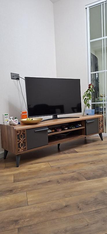 TV altlığı / mediya konsolu - Material: tünd rəngli laminat taxta, metal ayaqlar - Ölçü: təxmini 120–130 sm en, 45–50 sm dərinlik, 50–55 sm hündürlük (şəkillərə əsasən) - Üst səth TV və dekor üçün...