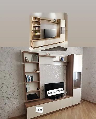 - Model 4: Divara montajlı komplekt. Yuxarı modul rəf bölməsi, yanlarda iki şaquli dolab, aşağıda uzun alt tumbə; ağ və ağac teksturalı kombinasiya. Divar paneli ilə harmonik kompozisiya.