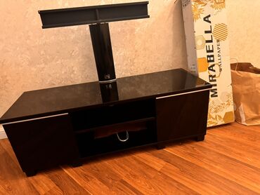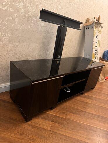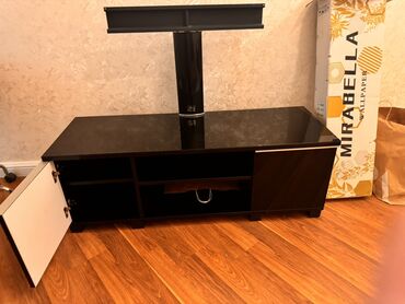 Mebel dəstləri 1) TV stend – ölçü: 180 sm - Üst hissədə uzun rəf və iki ədəd asma şkaf (açıq bölmələr və qapalı dolablar) - Aşağı hissədə geniş tumbalı TV altlığı, 3 qapalı bölmə, dekorativ halqa ...