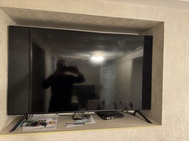 LED işıqlı TV divar paneli və dekorativ rəf sistemi - Dizayn: Ağ karkaslı, mərkəzdə TV üçün çərçivə; hər iki tərəfdə simmetrik dekorativ nişlər. - İşıqlandırma: Nişlərdə rəngli LED işıqlar (yaşıl ...