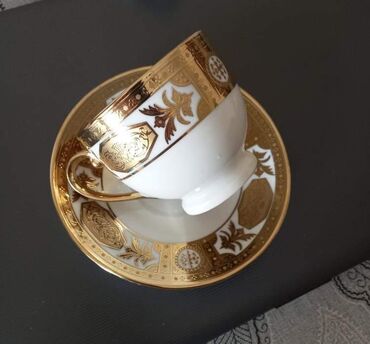 Zərif qızılı naxışlarla bəzədilmiş porselen çay dəsti - Material: incə porselen - Rəng və bəzək: ağ fon üzərində qızılı güllü ornament, fincan kənarında yunan naxışlı qızılı haşiyə; qızılı tutacaq...