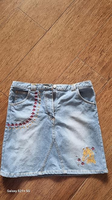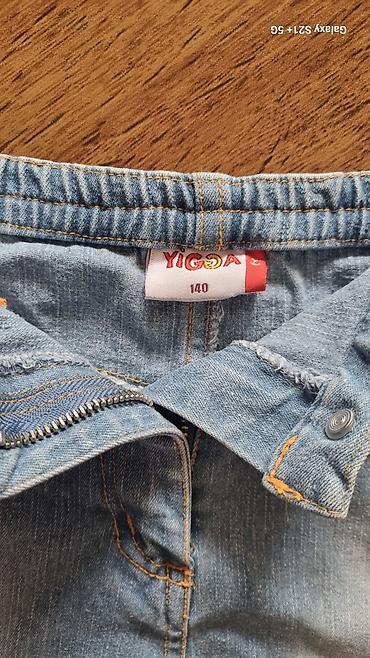 Uşaqlar üçün gündəlik geyimə və məktəb tərzinə uyğun, zövqlü naxışlı cins ətək. Markası: Yigga, etiketdə “140” ölçüsü.