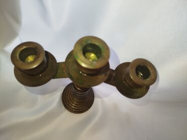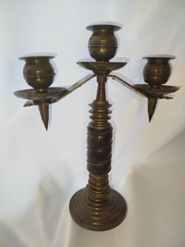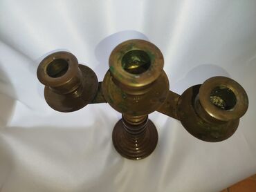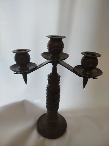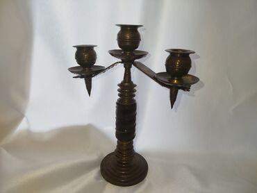Üç şam tutan, qəhvəyi rəngli, bürünc şamdan. Şamdanın mərkəzi hissəsi