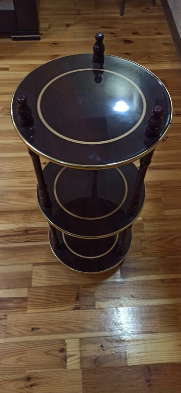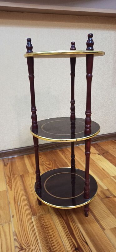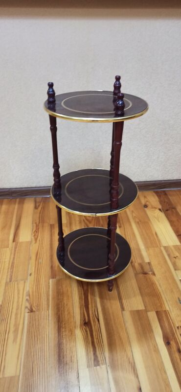 Çiçək və dekor üçün çoxsəviyyəli stend - Rəng: ağ rəngli dairəvi rəflər, xrom metal dayaqlar - Konstruksiya: iki ədəd dairəvi əsas platforma üzərində qurulmuş, mərkəzdə yüksək “piramida” forması; ...