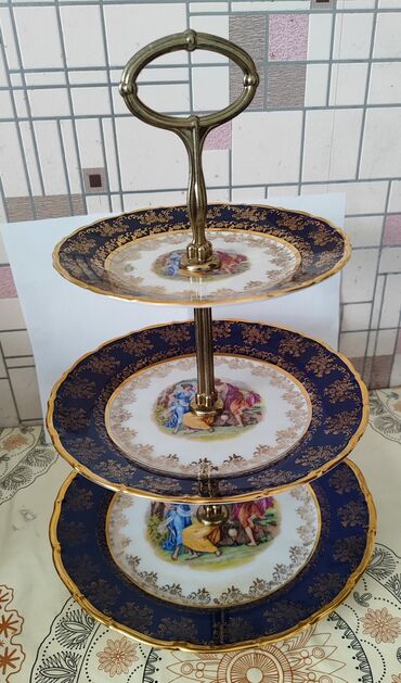 Üçlü boşqab üçmərtəbəli Göy -qızılı bagema. iki növdə satılır. Bir ədədinin qiyməti 25 Azn - ə satılır endirimlə.