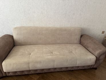İki rəng tonunda (bej və tünd qəhvəyi) yumşaq parça üzlü üçnəfərlik divan.