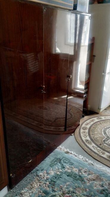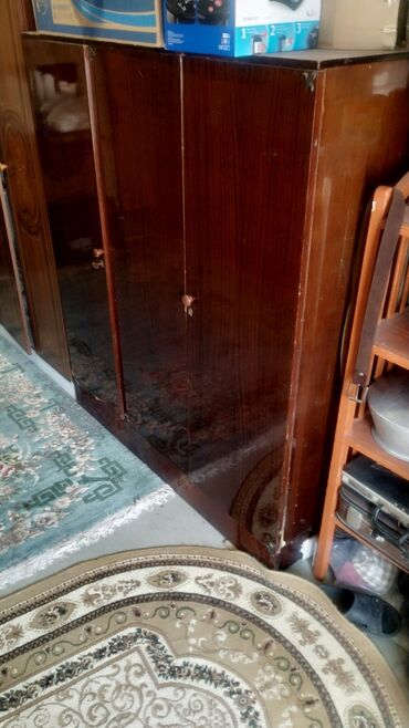 Tünd qəhvəyi rəngdə, üç qapılı dolab 30 35 ilin dolabıdı Xarici istehsaldı Hüdürlüyü 1.65 En 1.40 Sökülür
