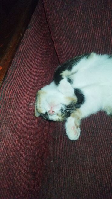 Yaxşı əllərəBu pişik sakit və rahat bir vəziyyətdə yatan üçrəngli bir pişikdir. Onun xəzi ağ, qara və narıncı/qəhvəyi ləkələrdən ibarətdir. Pişik rahat bir şəkildə uzanmış, pəncələri yuxarıya doğru qatlanmışdır. Üçrəngli xəzi onun fərqləndirici xüsusiyyətidir.