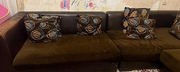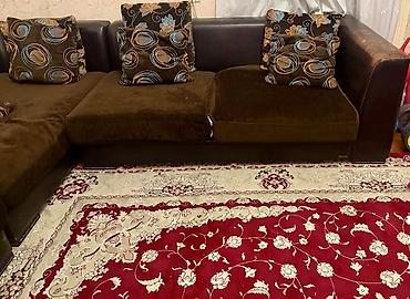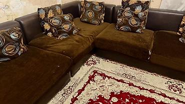 Künc divan dəsti - Forma: L-şəkilli künc divan, yumru bucaq keçidi ilə - Rəng: şokolad-qəhvəyi oturacaq və arxa hissə, açıq bej arxa yastıqlar - Parça: yumşaq, məxməri toxumalı döşəmə - Oturacaq: ...