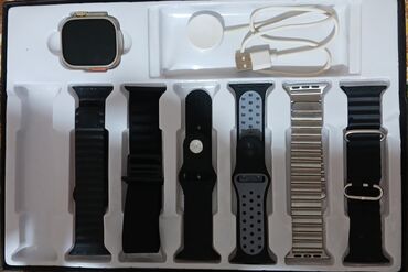 Smart saat dəsti – IWO Ultra (broşurada: “Ultra 3”). Qutuda olanlar: - Korpuslu smart saat (kvadrat, yan düymə və təkərli idarəetmə) - Maqnit USB şarj kabeli - 7 ədəd dəyişdirilə bilən qayış: - T...