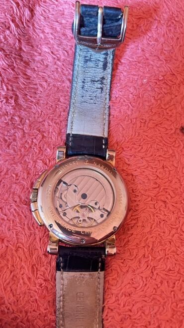- Qızılı korpus və tünd dərili qayışın zərif uyğunluğu, şüşə arxa qapaqla mexanizmi izləmə imkanı