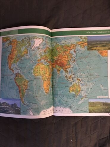 - Rəngli, böyükformatlı xəritələr: dünyanın fiziki xəritəsi, materiklər, okeanlar, relyef və iqlim zonaları, su hövzələri, təbii resurslar və s.