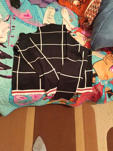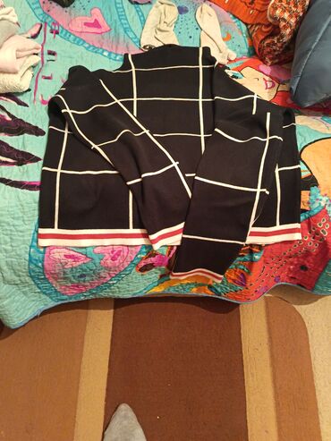 Qadın sviteri – qara rəngdə, nazik zolaqlı rebro (ribbed) toxuma. Uzunqol modeldir. Əlcək hissəsinə doğru manjetlər kontrast rənglərlə bəzədilib: açıq boz enli zolaqlar və iki nazik açıq çəhrayı zo...