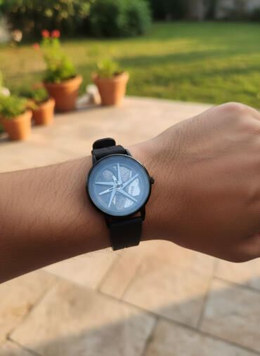 - Siferblat: şəffaf elementli dizayn, yan tərəfdə dekorativ mexanizm görünüşü