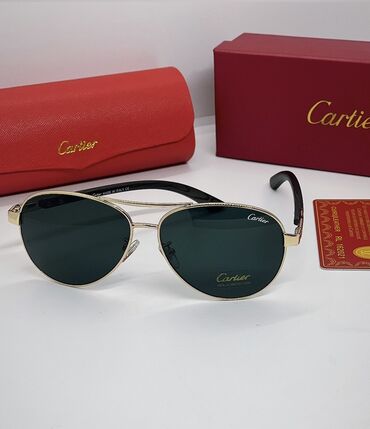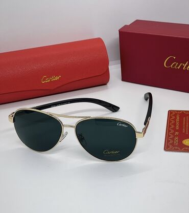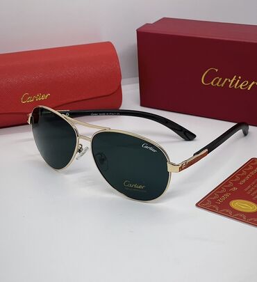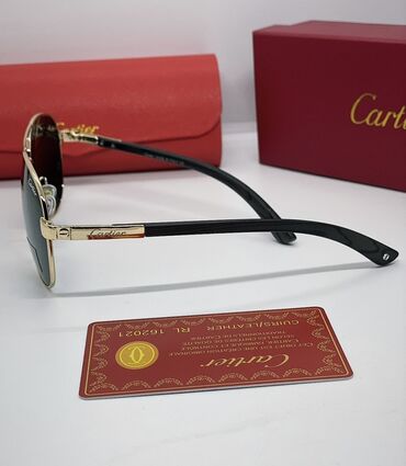 Pulsuz çatdırılmaQızılı çərçivəli və qara linzalı aviator tipli günəş eynəyi. Qulaqcıqlar qara rəngdədir və qızılı elementlərlə tamamlanır, üzərində "Cartier" loqosu yerləşir. Üçüncü şəkildə qulaqcığın iç tərəfində "Cartier MADE IN ITALY CE" yazısı görünür. Dəstə qırmızı rəngdə qoruyucu qabıq və uyğun rəngdə qutu daxildir.