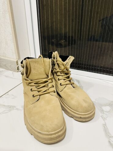 Bej rəngli qadın şnürlü iri altlı botlar - Rəng: açıq bej/nude - Model: hərbi/urban stilində qalın platformalı bot - Material: parlaq səthli süni dəri görünüşlü üstlük - Bağlanma: ön hissədə şnur,...