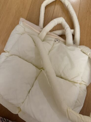 Qadın çantası – krem rəngli, yığımlı dizayn - Material: yumşaq, parıltılı eko‑dəri - Rəng: açıq krem/ivori - Forması: yarımay siluetli, ön-arka hissədə büzgülü - Tutacaq: qalın, elastik görünüşlü ...