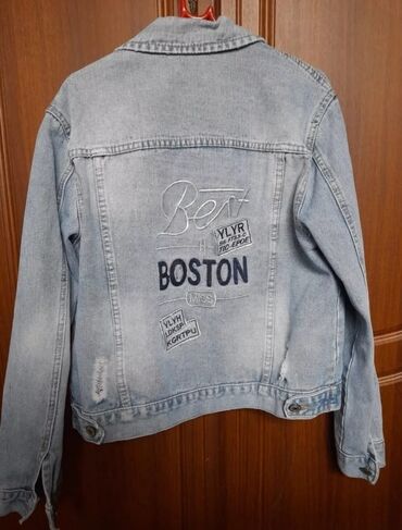 Unisex cins jaket - Material: 100% denim (açıq mavi, “stonewashed” effekti) - Dizayn: Klassik düyməli ön hissə, sərt yaxa; arxada “FASHION JEANS ERCGBHJKE” yazılı çap (dəfələrlə təkrarlanan), yuxa...