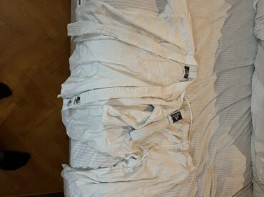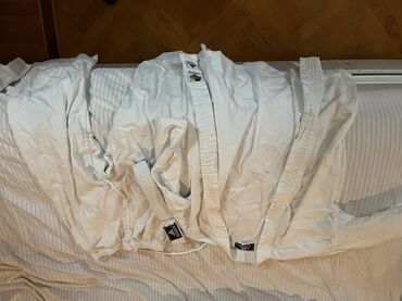 Aikido/Jiu-jitsu/Judo üçün ağ kimono komplekti - Brend: KHA - Material: 100% pambıq (etiketdə göstərilib) - Ölçü: 2/150 (təxmini 150 sm boy üçün) - Komplekt: üst gi və şalvar - Üst hissə qalın, pə...
