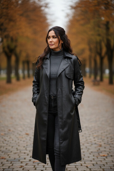 Qara dəridən uzun trençkot