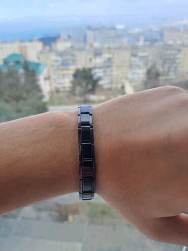 Qara-əsaslı, metal detallar ilə seqmentli dizayna malik maqnitli biləkliq. Xüsusiyyətlər: - Rəng: qara korpus, gümüşü metal birləşmələr - Material: paslanmayan metal ərintisi və maqnit elementləri...