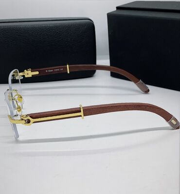 YeniDəbli və praktik uniseks eynək çərçivəsi. Şəffaf linzalar və qızılı rəngli metal detalları olan bu eynək, həm kişi, həm də qadınlar üçün uyğundur. Yan tutacaqları tünd qəhvəyi rəngli taxta görünüşlü materialdan hazırlanıb, bu da ona zərif və klassik görünüş verir. Hər növ üz formasına uyğunlaşmaqla gündəlik istifadə üçün idealdır. Eynəyin sol linzasında markanın emblemi yerləşir.