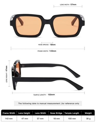 Qara rəngdə, dördbucaq formalı günəş eynəyi. Qəhvəyi rəngli linzaları var. Günəş şüalarından qorunmaq üçün idealdır.