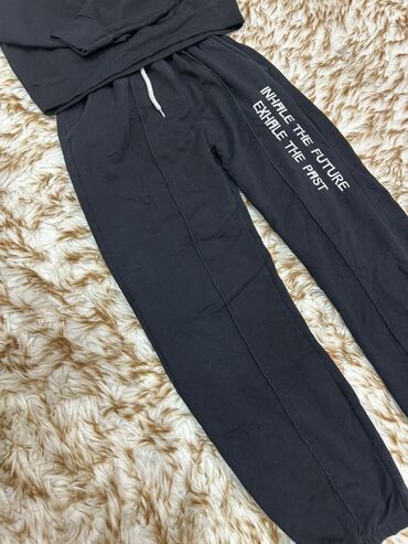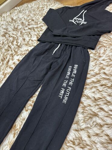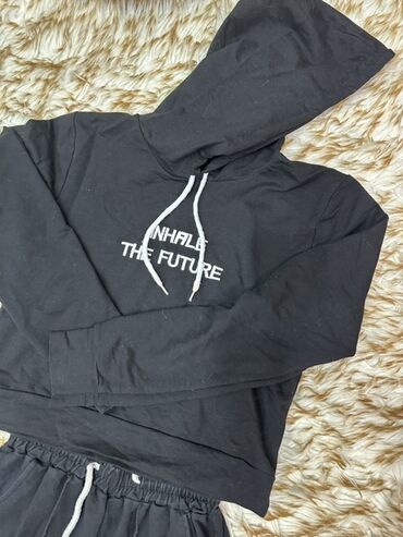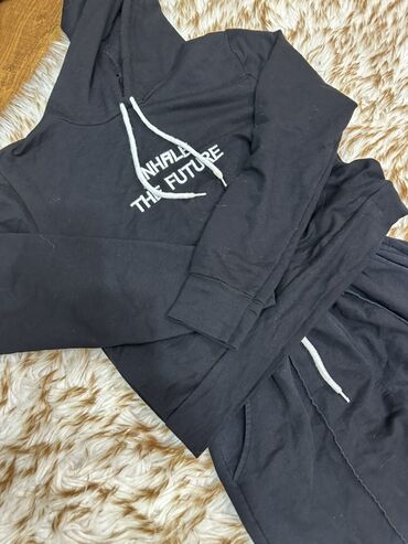 Qara idman dəsti - 2 hissədən ibarət: kapüşonlu, fermuarlı svitşot və şalvar - Rəng: tam qara, şalvarın aşağı hissəsində ağ fon üzərində “JUOMJ” yazısı olan detallı baskı - Svitşot: ön fermuar, ka...