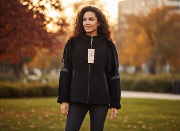 Qara rəngli kapüşonlu “koja” gödəkcəsi. Xüsusiyyətlər: - Material