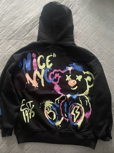 - Arxa hissə: böyük rəngli spreypaint tərzində ayı ilüstrasiyası, “NICE NYC” yazısı və “EST. 1975” qeyd olunub