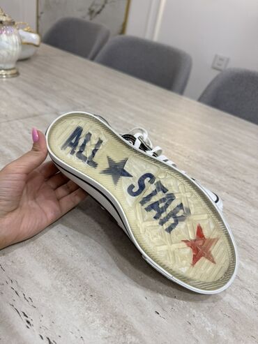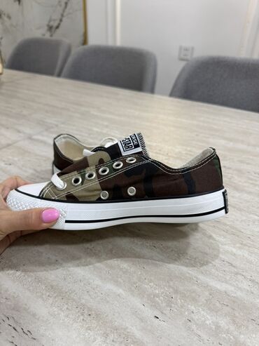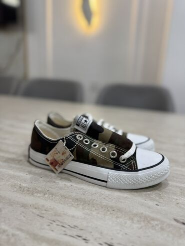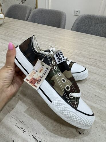 Kamuflaj naxışlı, ağ bağcıqları və qalın ağ rezin altlığı olan, aşağı kəsim Converse ketlər. Ayaqqabıların yan tərəfində "CONVERSE ALL STAR" loqosu yerləşir. Ağ rezin burun hissəsi və ayaqqabının ətrafındakı qara zolaq xarakterik dizaynı tamamlayır. Bu ketlər rahatlıq və dəbli görünüş təklif edir, gündəlik istifadə üçün uyğundur.