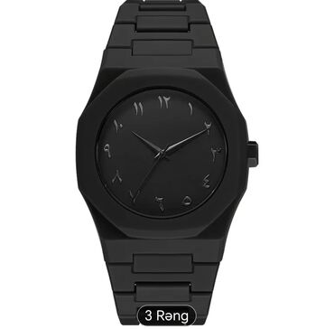 1) Tam qara minimalist dizayn – ərəb rəqəm işarələri ilə monoxrom siferblat, metal korpus və uyğun rəngli bənd