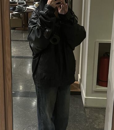 Razmer M ve L üçün Qara oversize cins köynək/jaket - Model: uzun qollu, oversize kəsim - Material: qalın cins parça - Bağlanma: ön hissədə metal düymələr - Dizayn: sinədə iki qapaqlı paça, müxtəl...