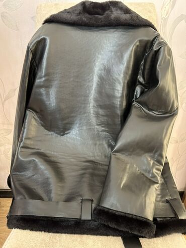 EndirimsizQara rəngdə isti qış gödəkçəsi – süni dəri görünüşlü üst material və iç tərəfi tam xəz (plyuş) ilə örtülmüş. Oversize/aviasiya üslubunda kəsim, geniş xəzli yaxa və qalın xəzli manjetlər. Asimmetrik ön fermuar, iki ədəd yan fermuarlı cib. Aşağı hissədə dekorativ/idarə olunan kəmər və metal halqalar, ətək və ələklərdə xəz haşiyə. Arxa hissə hamar, parlaq səthlidir. Soyuq havalar üçün rahat, həm casual, həm də şık kombinlərə uyğun. Rəng: tam qara (üst və xəz).